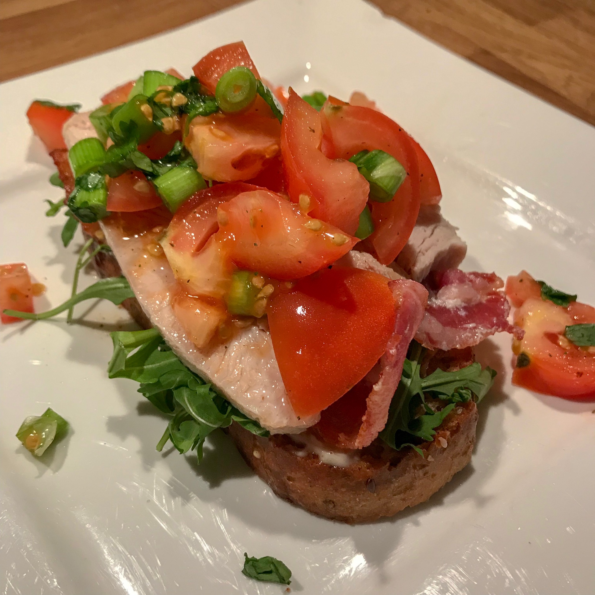 Smør et tynt (eller tykt! Who am I to judge?) lag med sennep og majones på brødskiven. Topp med en god dose ruccola (eller annen salat), bacon, kjøtt og tilslutt tomatblandingen.