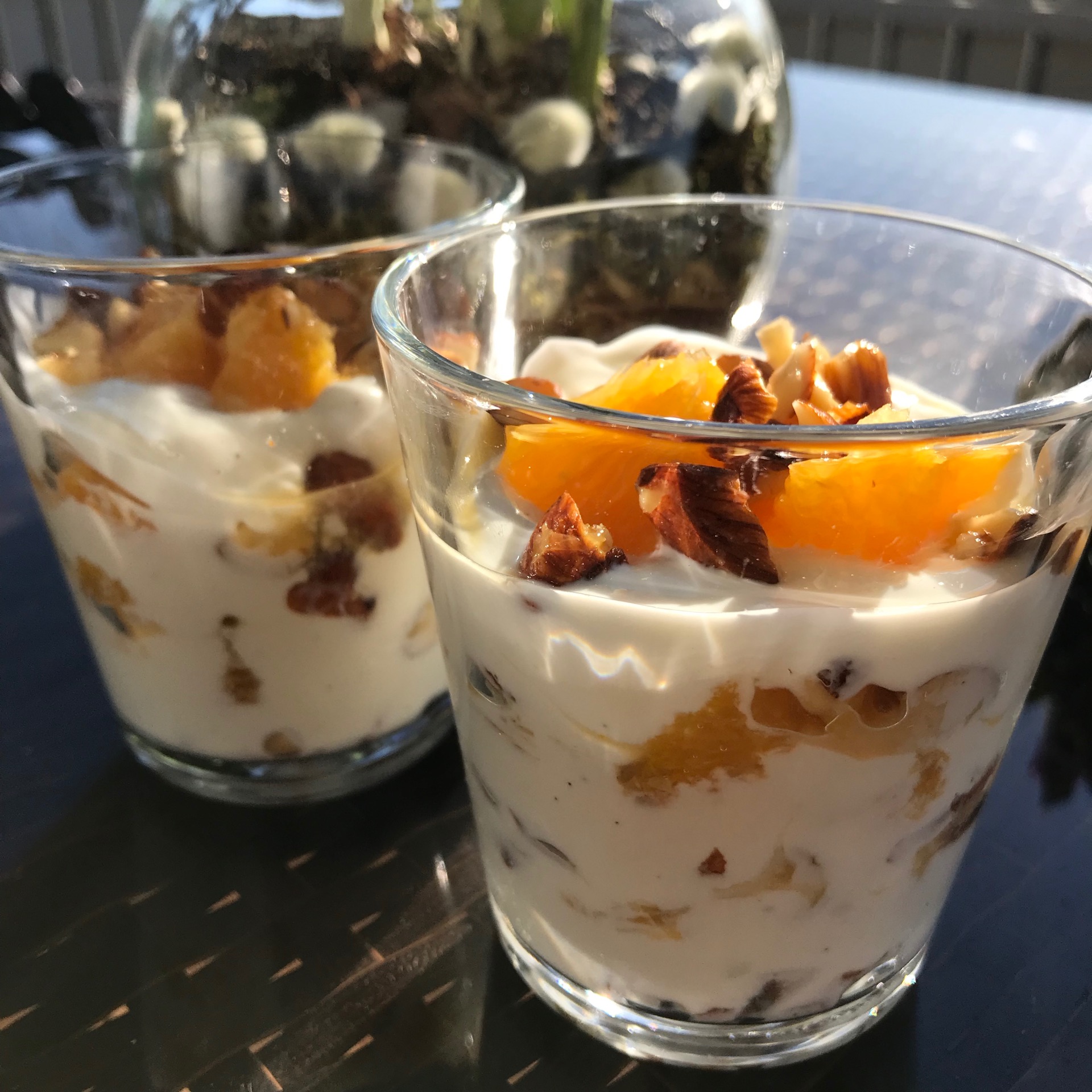 - Fordel mandler, kesam og appelsin lagvis i glass eller porsjonsskåler. Begynn og avslutt med mandler. Topp gjerne med litt ekstra honning og mørk sjokolade.